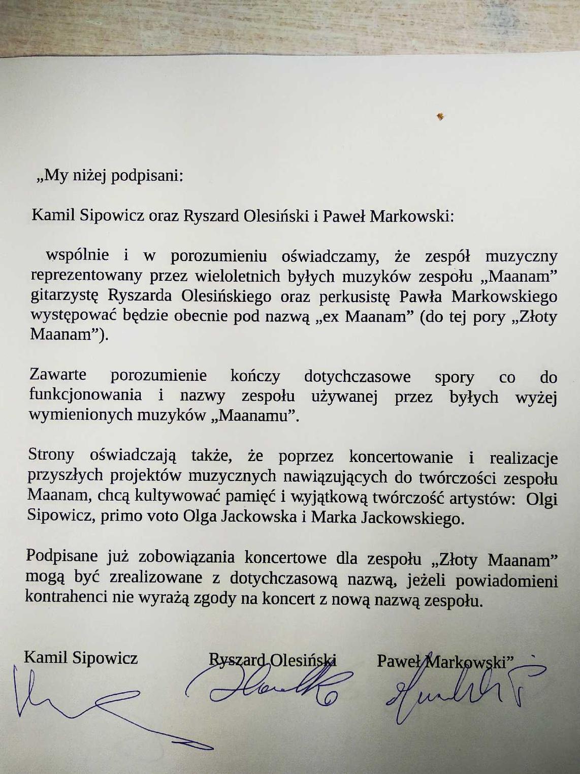 17 stycznia 2019 r doszło do historycznego pojednania jak nazwała to prasa wieloletnich muzyków Maanamu: gitarzystę Ryszarda Olesińskiego oraz perkusistę Pawła Markowskiego z Kamilem Sipowiczem mężem Kory w sprawie funkcjonowania i używania nazwy zespołu. 18 stycznia 2019 podpisano porozumienie w tej sprawie. ”Złoty Maanam” kończy działalność a zastępuje go nazwa „ex Maanam”. Przed świętami 2018r wokalistka Karolina zrezygnowała ze współpracy ze „Złotym Maanamem” więc jej odejście przyczyniło się niewątpliwie do zmiany nazwy zespołu gdyż ” Złoty Maanam” bez jej udziału nie miał już sensu. Kontynuacją „Złotego Maanamu” jest teraz „ex Maanam”